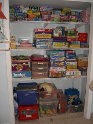 The closet was reorganized to house the puzzles and games. Games were organized by type, and placed at a height where the children could easily access them and be responsible for putting them away.